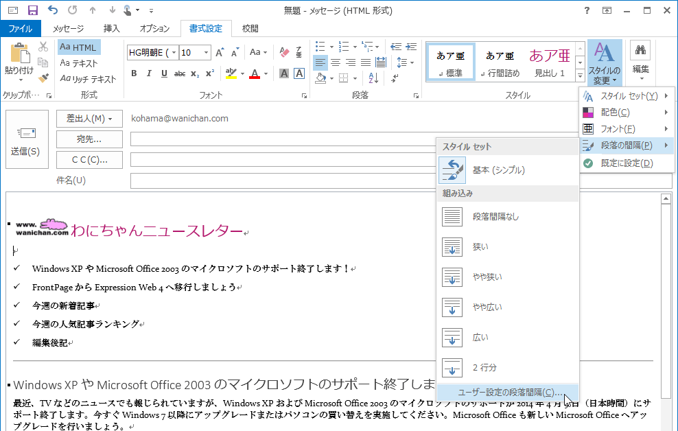- [スタイル]グループの[スタイルの変更]をクリックし、[段落の間隔]をポイントして、[ユーザー設定の段落の間隔]を選択します。