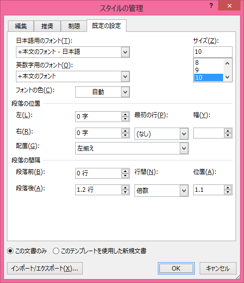 - [スタイルの変更]ダイアログボックスの[既定の設定]タブが開くので、行間、段落前、段落後の幅などを指定し[OK]ボタンをクリックします。