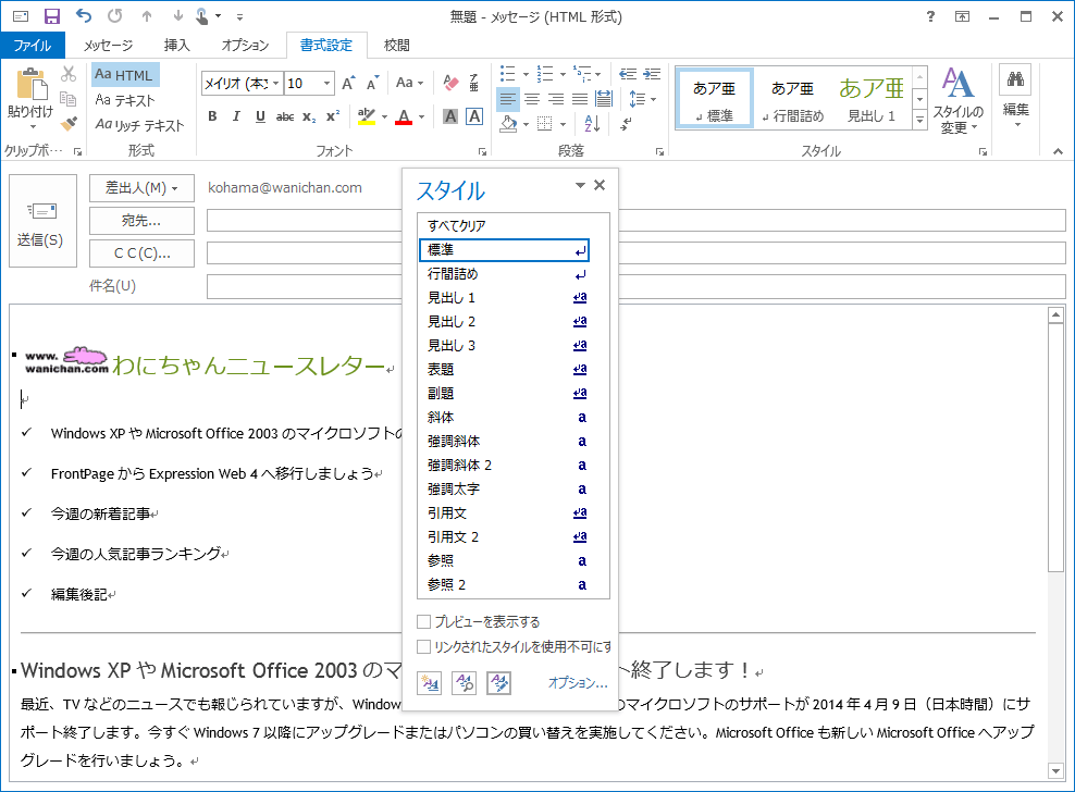 既定では、プレビューウィンドウを表示するようにチェックがついています。プレビューウィンドウを表示することによって、適用しなくても事前にどのようなスタイルか確認ができます。