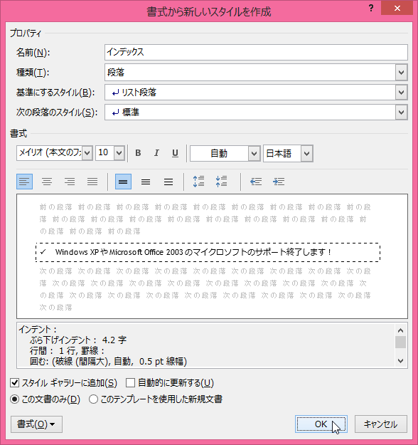 - [次の段落のスタイル]は、そのスタイルを入力してEnterキーで次の段落時にどのスタイルにするかを選びます。通常のスタイルの場合は[標準]を選択します。