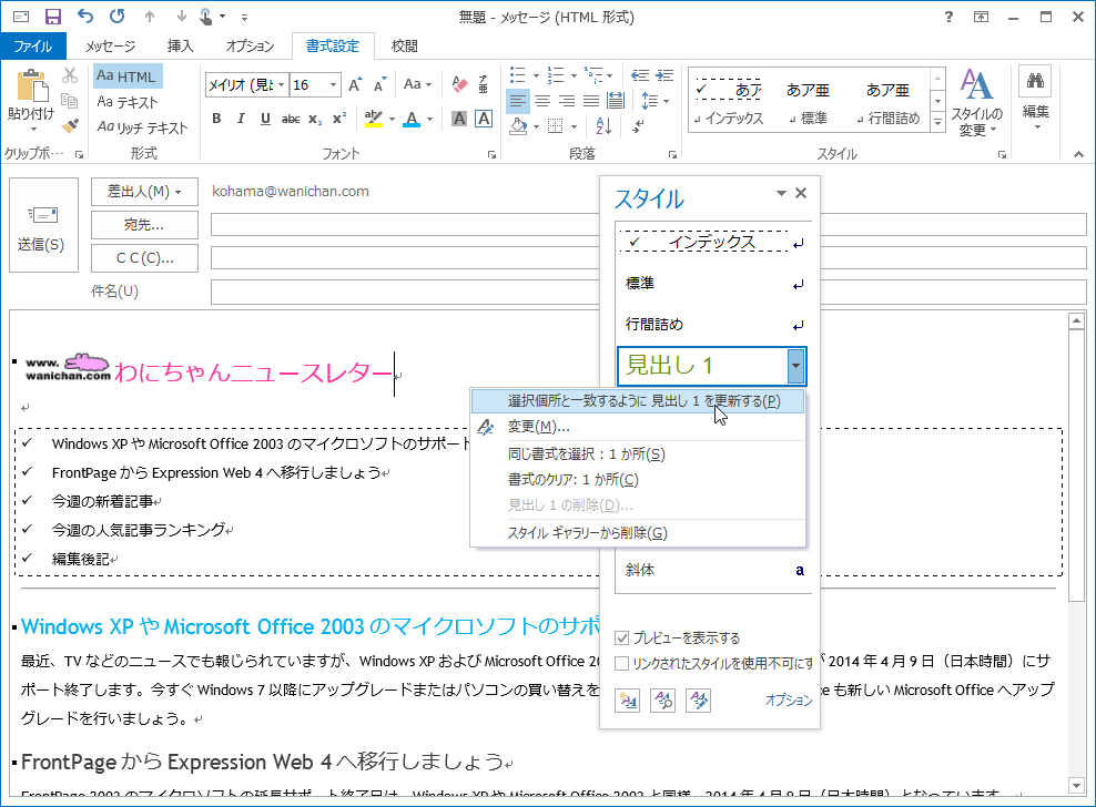 本文テキスト上にスタイルを直接変更して、スタイル一覧からスタイルを更新することができます。たとえば、見出しっぽいスタイルを視覚的に見出しのようにスタイルを適用したあとに、そのスタイルの箇所を選択して、スタイル一覧から見出しスタイルを右クリックして選択個所を一致するようにスタイルを更新することで、後でスタイルを整えることができます。