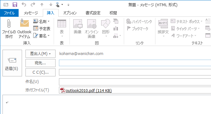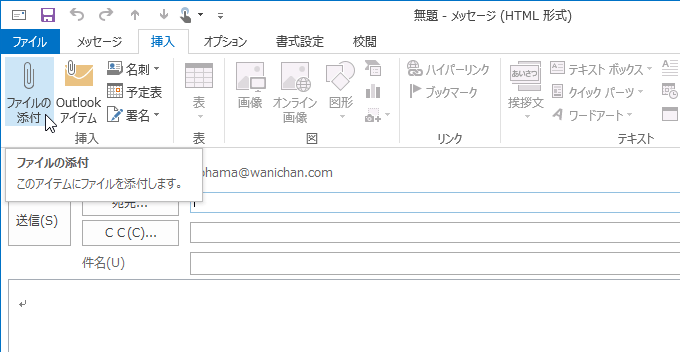 - [挿入]グループの[ファイルの添付]をクリックします。
