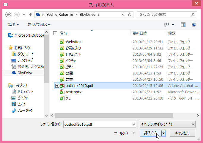 - 添付したいファイルを指定して[挿入]ボタンをクリックします。