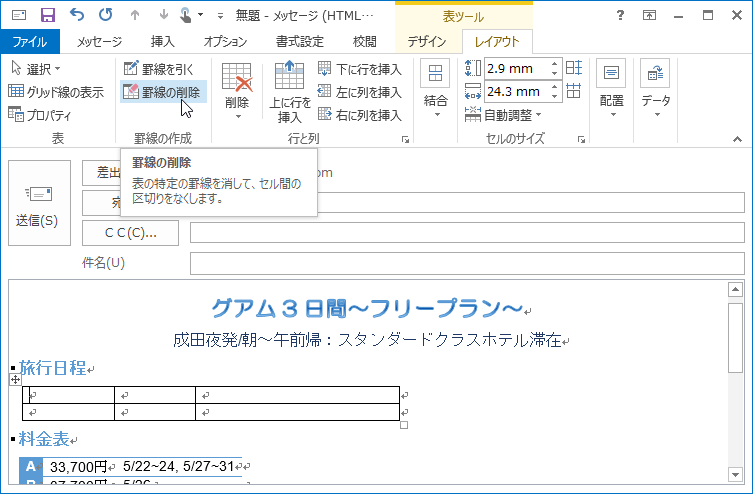 - [表ツール]の[レイアウト]タブの[罫線の削除]をクリックします。