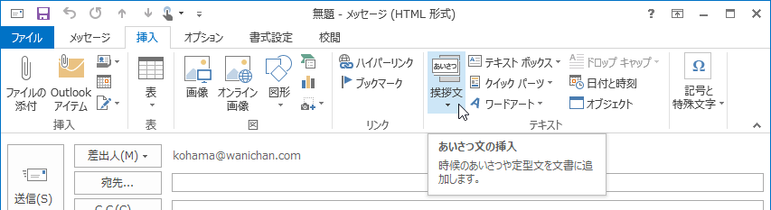 - [テキスト]グループの[挨拶文]をクリックします。