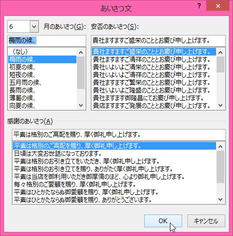 - [あいさつ文]ダイアログボックスが表示されたら、現在の月を選択し、それぞれ相手にふさわしいフレーズを選択して[OK]ボタンをクリックします。