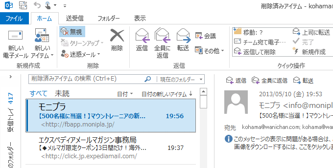 - 削除済みアイテムにある対象とするスレッドを選択して、[ホーム]タブの[無視]をクリックします。