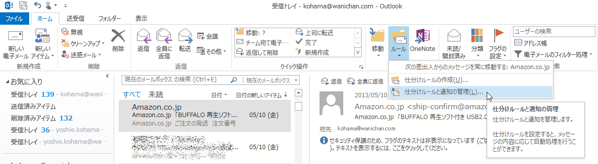 - [ホーム]タブの[移動]グループの[ルール]をクリックして、[仕分けルールの通知と管理]をクリックします。