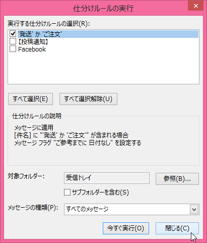 - 実行したい仕分けルールを選択して[今すぐ実行]ボタンをクリックします。