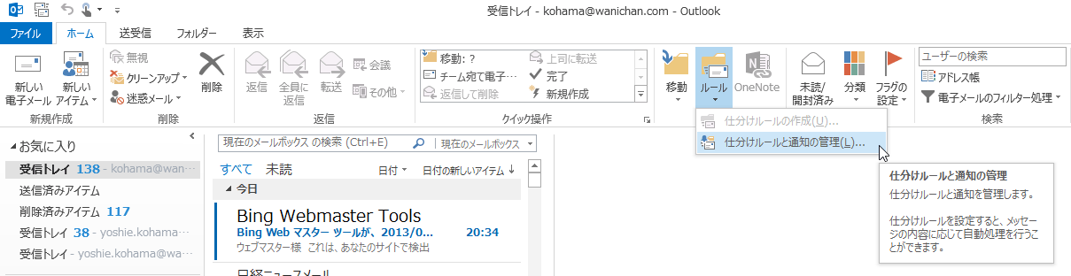 - [ホーム]タブの[移動]グループの[ルール]をクリックし、[仕分けルールの通知と管理]をクリックします。