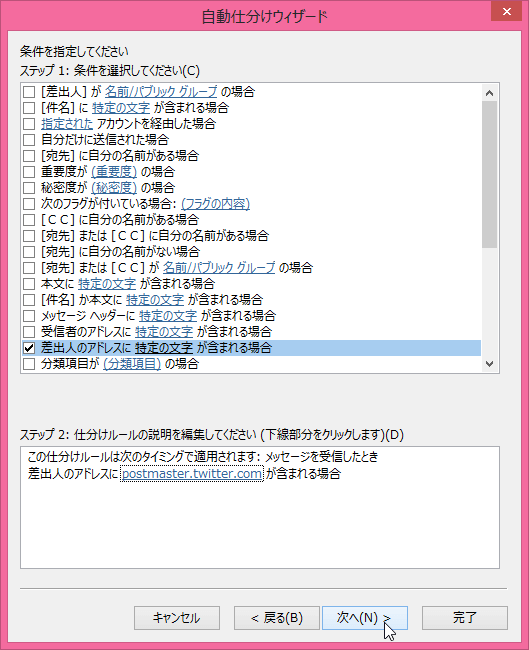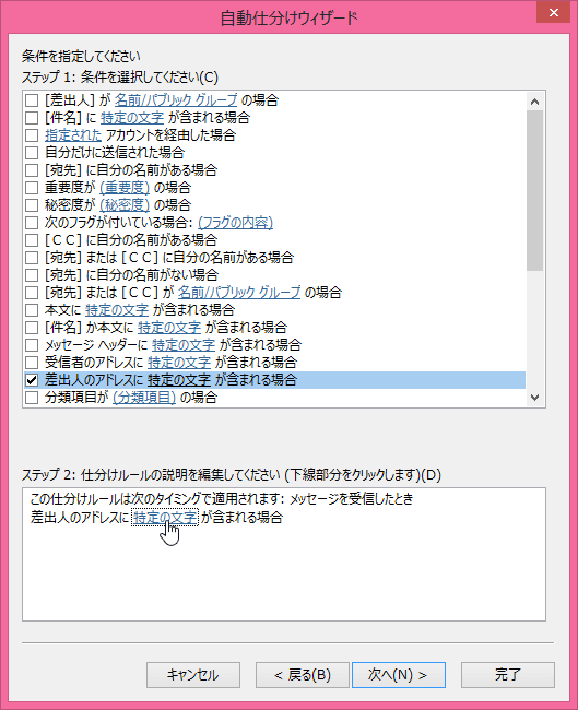 - 「差出人のアドレスに特定の文字が含まれる場合」にチェックを入れて、ステップ2の下線をクリックします。