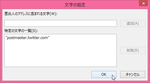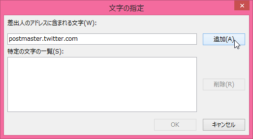 - [文字の指定]ダイアログボックスの[差出人のアドレスに含まれる文字]ボックスに「@twitter.com」と入力して[追加]ボタンをクリックします。
