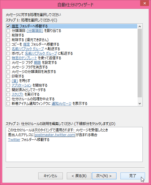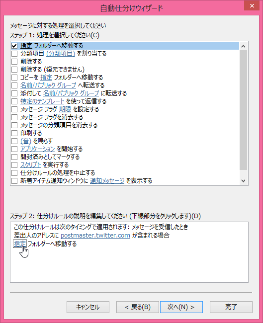 - ステップ1の[指定フォルダーに移動する]にチェックを入れて、ステップ2の下線部分をクリックします。