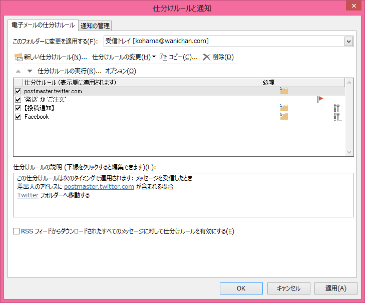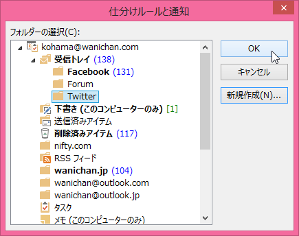 ここでは、Twitterの通知メールをまとめてTwitterフォルダーに移動してみましょう。Twitterの通知メールアドレスは必ず @twitter.com が含まれています(この記事執筆当時はpostmaster.twitter.comでしたが、現在仕様変更されたようです)。そこで、差出人のアドレスに「@twitter.com」が含まれる場合に「Twitter」フォルダーに移動する方法について説明します。