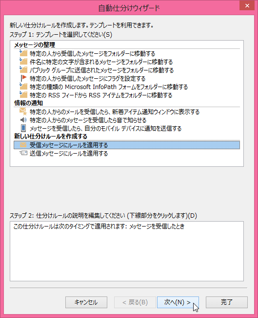- [新しい仕分けルールを作成する]グループの[受信メッセージにルールを適用する]を選択して[次へ]ボタンをクリックします。