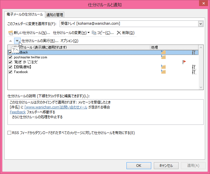 - 仕分けを処理する優先順位を変更したいルールを選択して、[上へ]または[下へ]ボタンをクリックします。
