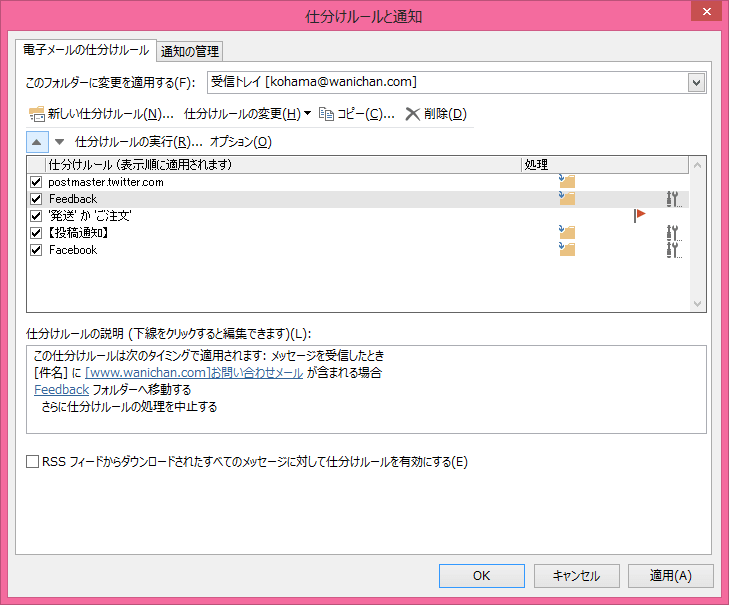 仕分けルールは送受信時に最初に実行されます。複数の仕分けルールを作成すると、後で設定したルールほど処理される順序が先になります。もし、その順序を適切に調整しないと、設定された複数のルールに該当したメールが受信される時などにおいて、意図しない処理がされるなどのエラーが発生する場合があるので注意してください。
