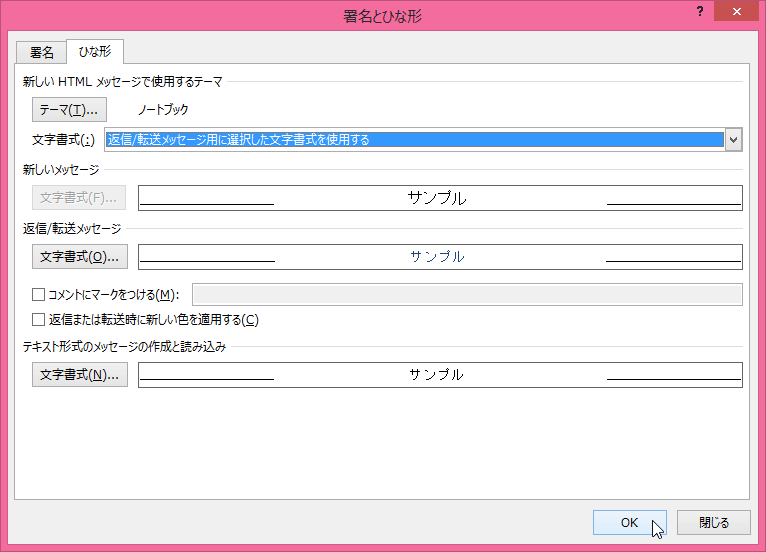 - [文字書式]のボックスより[返信/転送メッセージ用に選択した文字書式を使用する]を選択して、[OK]ボタンをクリックします。