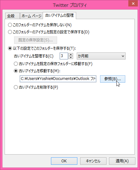 - [古いアイテムを移動する]を選択して[参照]ボタンをクリックします。