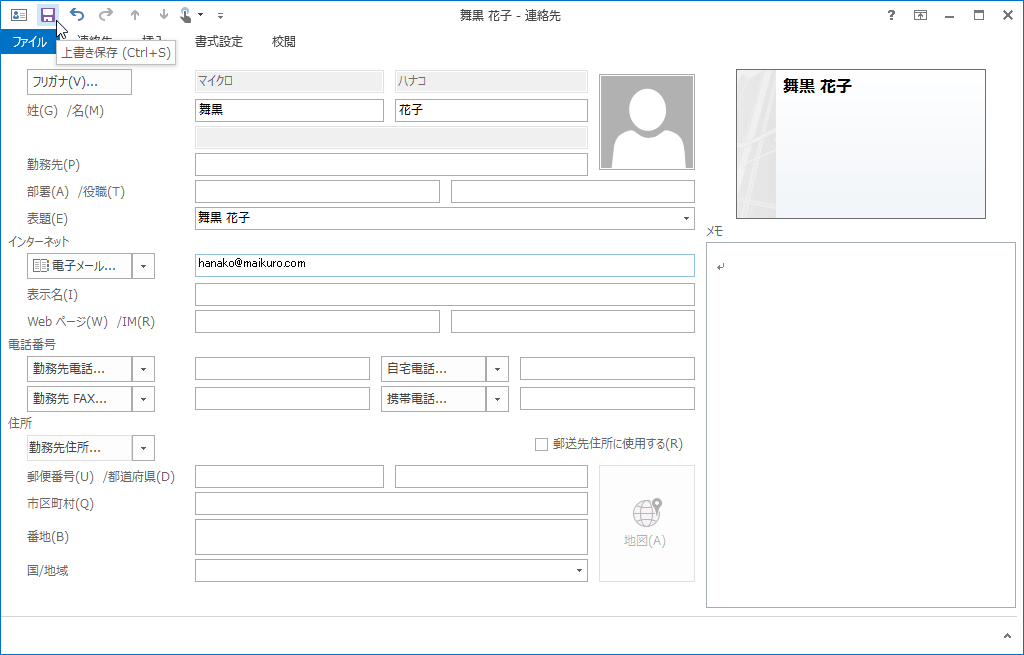 [連絡先]タブの[保存して閉じる]をクリックすると、保存してそのウィンドウを閉じることができます。