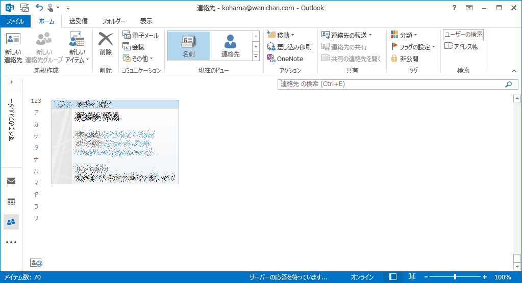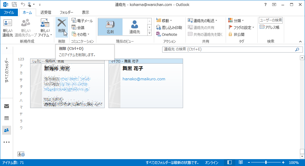Outlook 2013で削除したい連絡先を選択し、[ホーム]タブの[削除]をクリックするか、Deleteキーを押します。削除された連絡先は元に戻せないので注意してください。