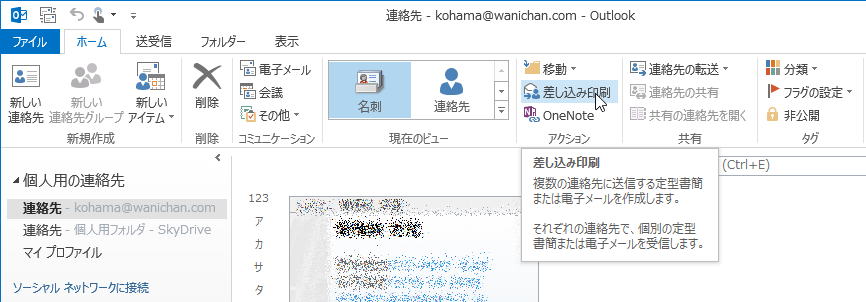 Outlookの連絡先データを用いて簡単に差し込み印刷をするには、Outlookの連絡先画面から操作するとスムーズです。