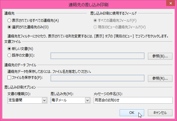 - [連絡先の差し込み印刷]ダイアログボックスが表示されたら、[連絡先]オプションには[選択された連絡先のみ]が選択されていることを確認します。