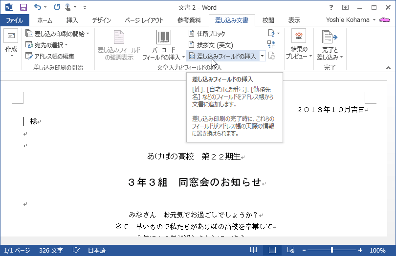 - [差し込み文書]タブを開き、[差し込みフィールドの挿入]をクリックします。
