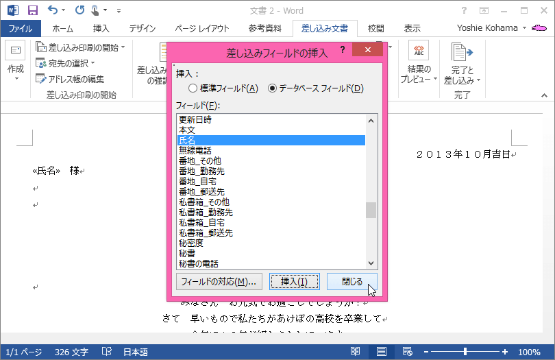 - 差し込みフィールドを選択して[挿入]ボタンをクリックします。