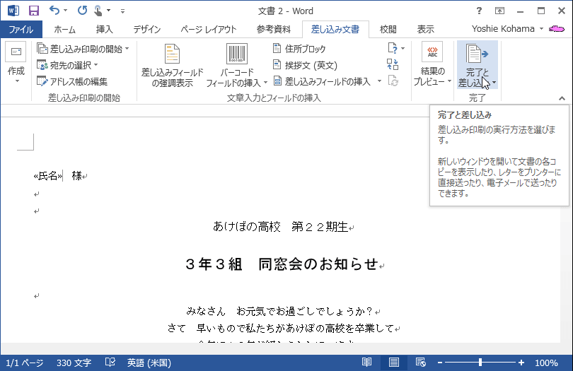 - [差し込み文書]タブの[完了と差し込み]をクリックします。