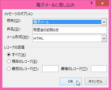 - [電子メールに差し込み]ダイアログボックスが表示されたら、件名、メール形式、レコードの送信範囲を指定して[OK]ボタンをクリックします。