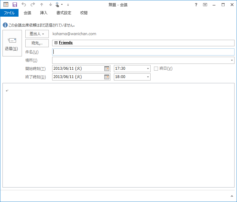 - 選択した連絡先宛ての新しい会議ウィンドウが開いたら、件名、場所、会議時間、詳細を入力し、[送信]ボタンをクリックします。
