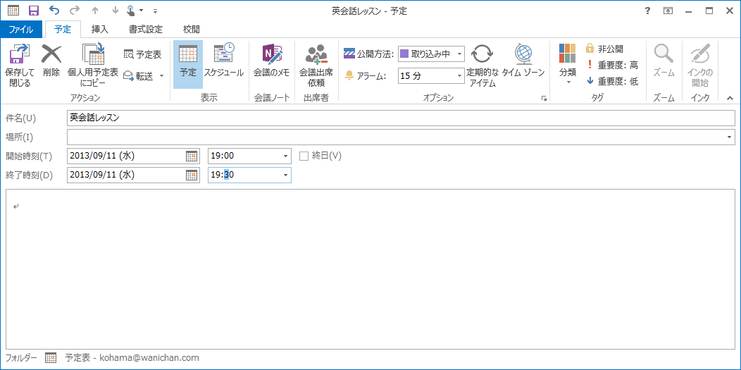 - [予定]ウィンドウの[件名]ボックスに、予定の簡単な説明を入れます。