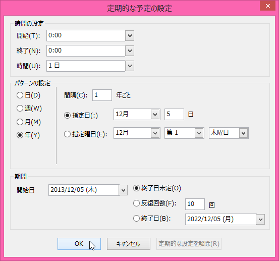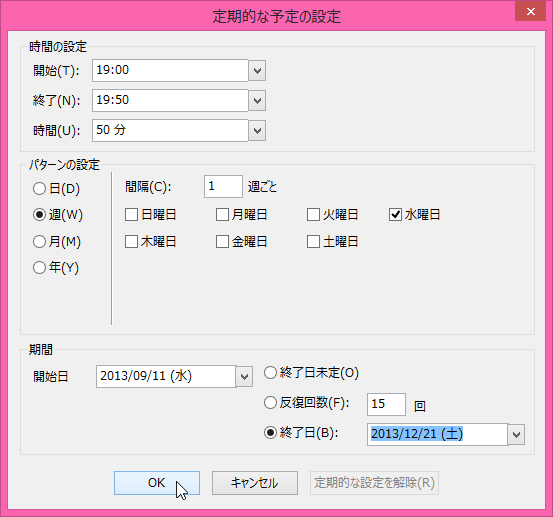 - [期間]グループから開始日と終了日を設定します。回数が決まっている場合[反復回数]を選択してその数値を入力します。終了日がわかっている場合、その終了日を設定して[OK]ボタンをクリックします。