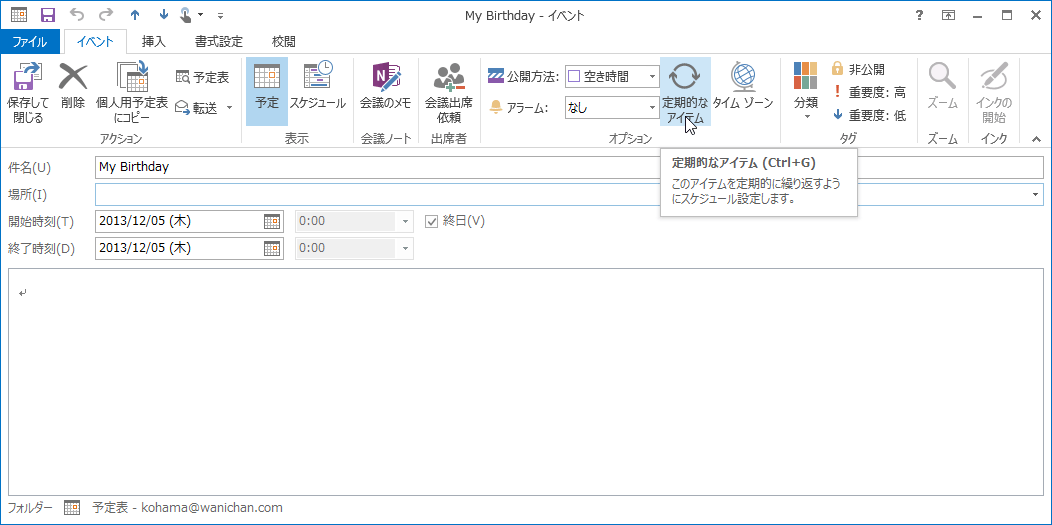 - [予定]タブの[オプション]グループの[定期的なアイテム]をクリックします。