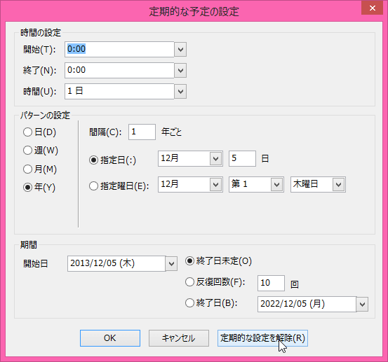 [定期的な予定の設定]ダイアログボックスを表示し、[定期的な予定を解除]ボタンをクリックします。