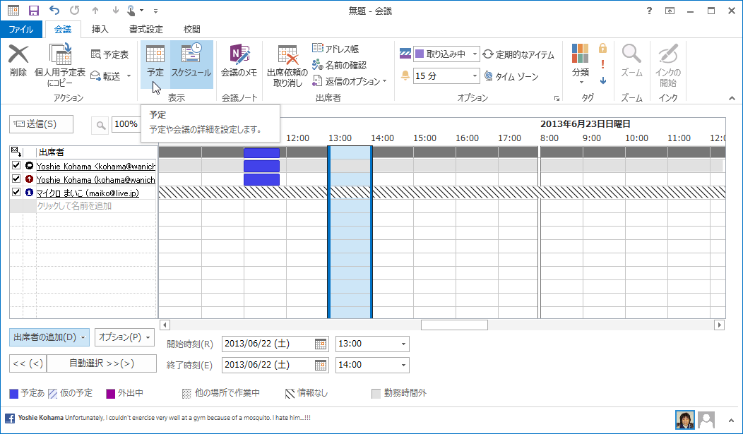 Outlook 2013で[新しい会議]をクリックして会議を作成し、[会議]タブの[スケジュール]をクリックして出席者を追加して、出席者の空き状況を確認しながら会議時間を指定し[送信]ボタンをクリックします。