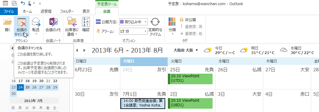 会議の予定を取り消すには