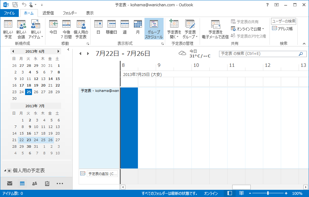 Outlook 2013に用意されている予定表の表示形式の種類は5つあります。カレンダー形式の他に日単位、週単位、稼働日単位、そしてグループスケジュールがあります。
