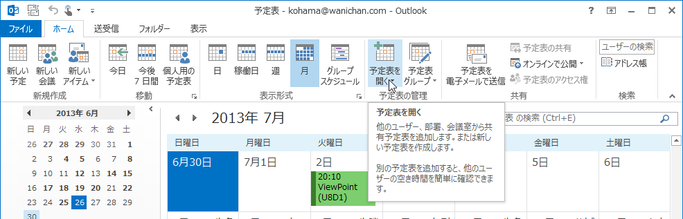 - [ホーム]タブを開き、[予定表の管理]グループから[予定表を開く]をクリックします。