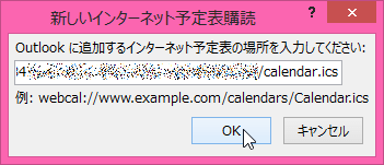- [新しいインターネット予定表購読]ダイアログボックスに webcal://から始まるアドレスを入力して[OK]ボタンをクリックします。