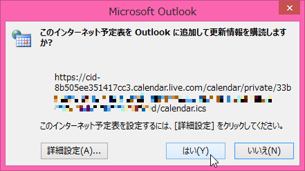 - 「このインターネット予定表をOutlookに追加して更新情報を購読しますか?」というメッセージが表示されたら[はい]ボタンをクリックします。