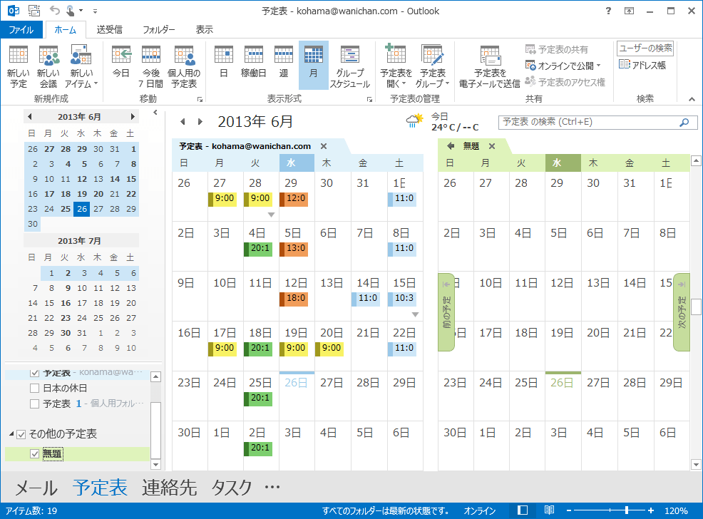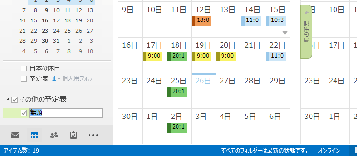 インターネットから予定表を開いたとき、[その他の予定表]ツリーに「無題」が追加されます。あとで名前を変更することが可能です。