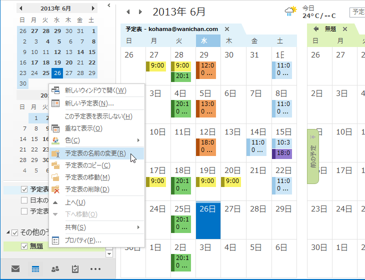 [無題]を右クリックして、ショートカットメニューより[予定表の名前の変更]を選択