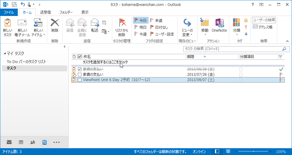 ToDoバーのタスクリストを開くと、「新しいタスクを入力してください」ボックスがあり、タスクを開くと「タスクを追加するにはここをクリック」というボックスがあり、そのボックスで素早くタスクを作成することができます。