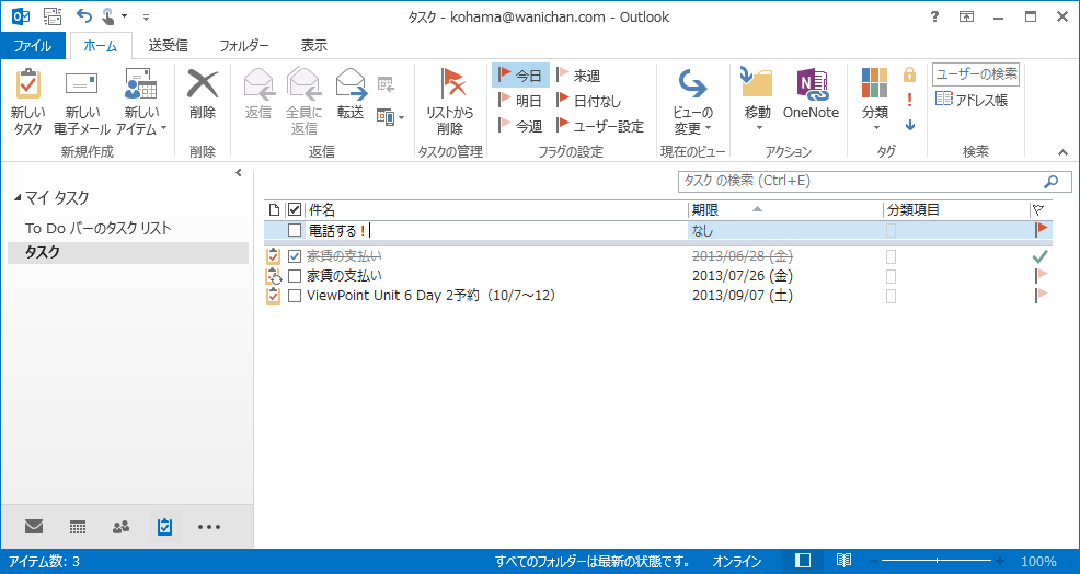 Outlook 2013でタスクを開くと、[マイ タスク]のなかに「ToDoバーのタスクリスト」と「タスク」の2種類存在します。ToDoバーのタスクリストとは、フラグが付けられたすべてのアイテムのリストも含まれます。タスク以外のコンポーネント(メールや予定表とか)でフラグを付けると、ToDoバーのタスクリストに追加されます。なお、ToDoバーのタスクリストには、追加されたタスクアイテムもリストされます。