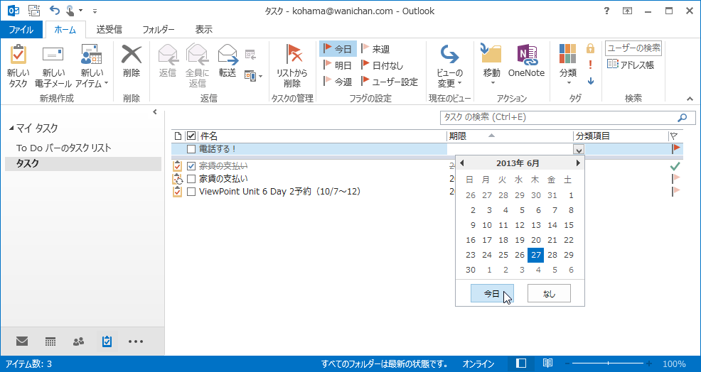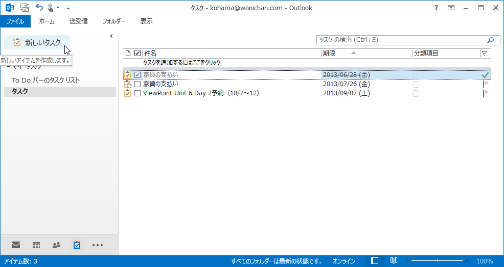 - [ホーム]タブの[新しいタスク]をクリックします。リボンコマンドが非表示の場合は画面左上の[新しいタスク]をクリックします。[ホーム]タブの[新しいタスク]をクリック