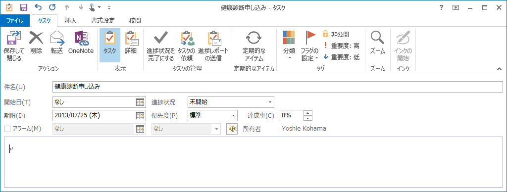 - [ホーム]タブを開き、[保存して閉じる]をクリックするとタスクが保存され、ウィンドウが閉じられます。