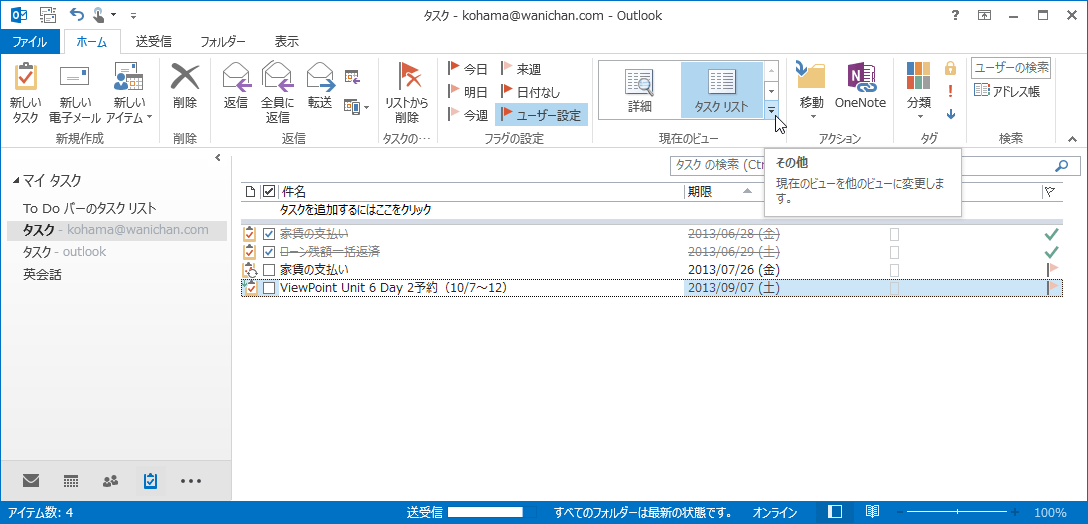 タスクを開くと、既定では「タスクリスト」ビューになります。このほかにもOutlook 2013では、さまざまなビューが用意されています。