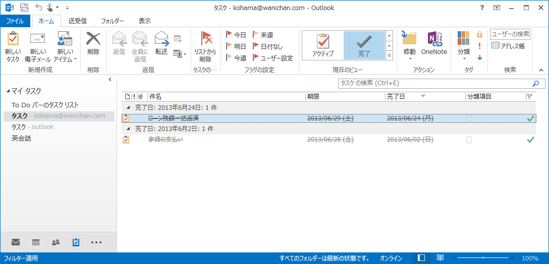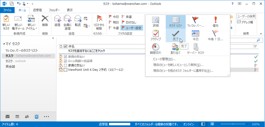表示するフィールド:タスクの完了、アイコン、優先度、添付ファイル、件名、進捗状況、期限、更新日時、完了日、フォルダー、分類項目、フラグ